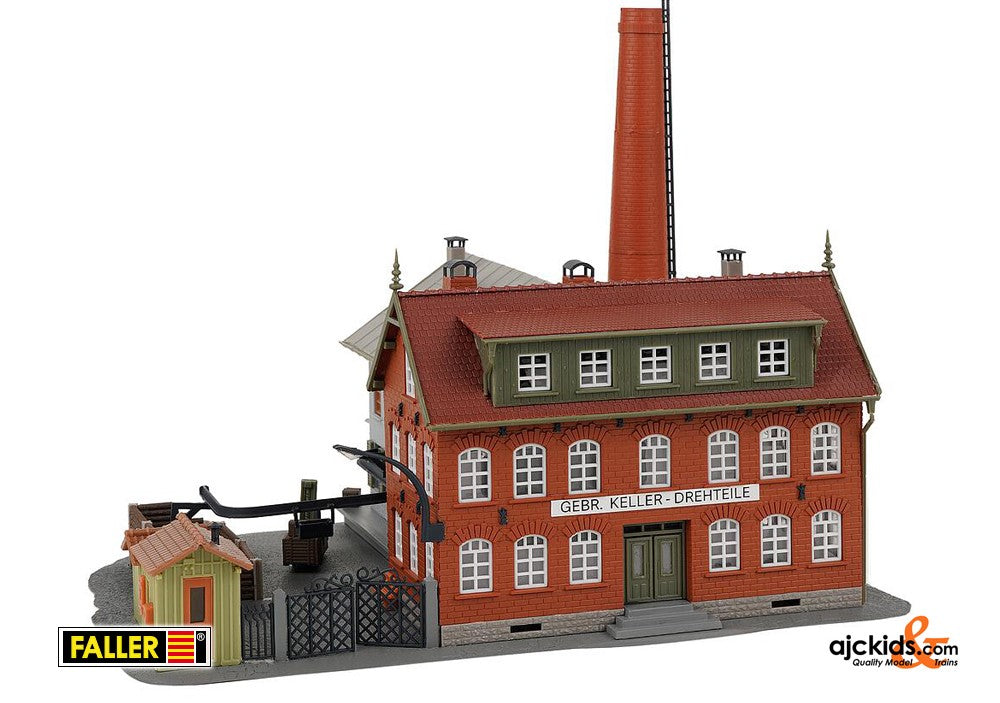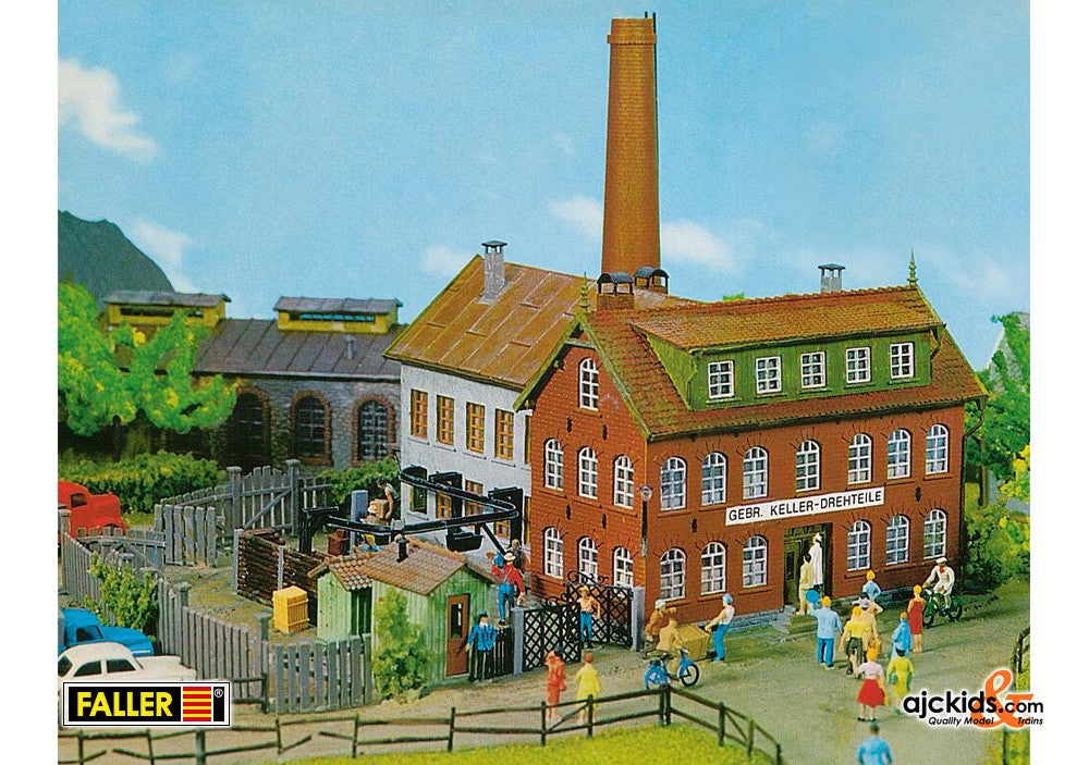 Classic! Small turned parts factory with administration building, production wing, gatehouse, high chimney and a transport system. Base plate enclosed.