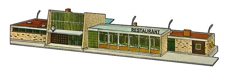 »Modern station with passenger hall flooded with light. The restaurant section can be furnished with the tables and benches supplied to give the building a very natural atmosphere.« (Text from the original catalogue).