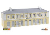 Long two-Story passenger building with facade of symmetrical structure, semicircular arched windows and doors on the ground floor, a continuous moulding and sash bar windows and plain frames in the upper Story.