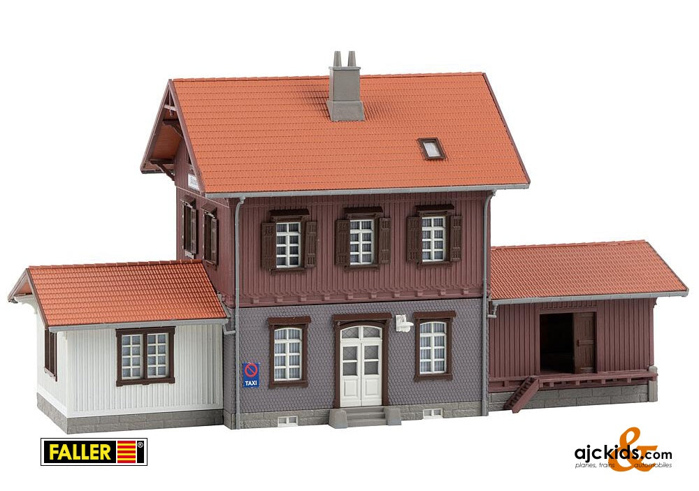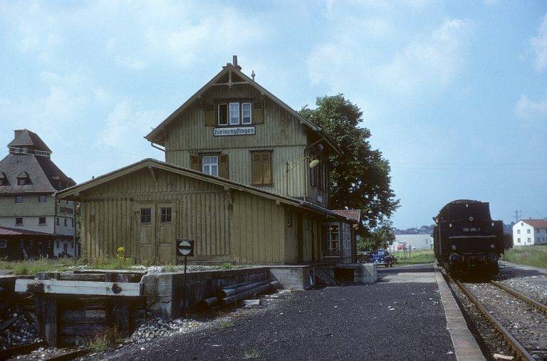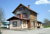 Royal Württemberg State Railways. Two-story station building with shingle and board formwork as well as two side extensions. The original model of this Württemberg type IIa standard railway station is located in "Kleinengstingen" in the Swabian Alb.