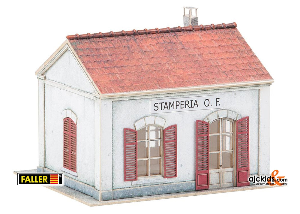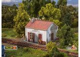 A nice finishing technique: digital printing! Aged laser-cut model of a rural halt similar to an original located in Italy, with plain angle pilasters at the four corners of the building, arched brickwork window lintels and characteristic red shutters. Decoration for international inscriptions supplied.