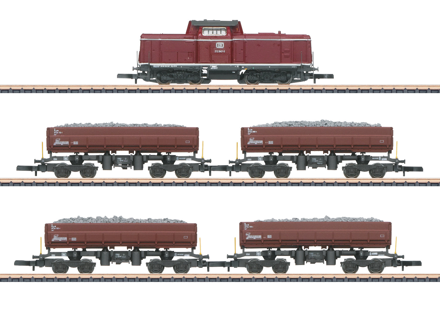 Model: The locomotive has a motor with a bell-shaped armature. All axles of both trucks are powered. Warm white / red LEDs are used for the headlights / marker lights. The cars are finely imprinted, each with its own car number, and they have a load of "gravel".