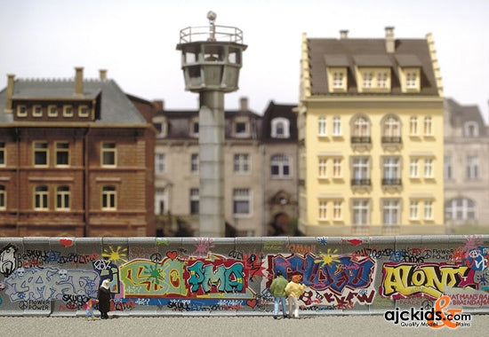 The concrete wall can be used to surround buildings, open plazas, etc., or as GDR border wall (e.g. in connection with the Busch No. 1015 Watch Tower). The wall consists of 12 mm broad and 35 mm high sections, which can be joined together. Overall length 57 cm. Supplied inclusive cut-out sheet with warning signs (border) and/or typical advertising posters and placards.