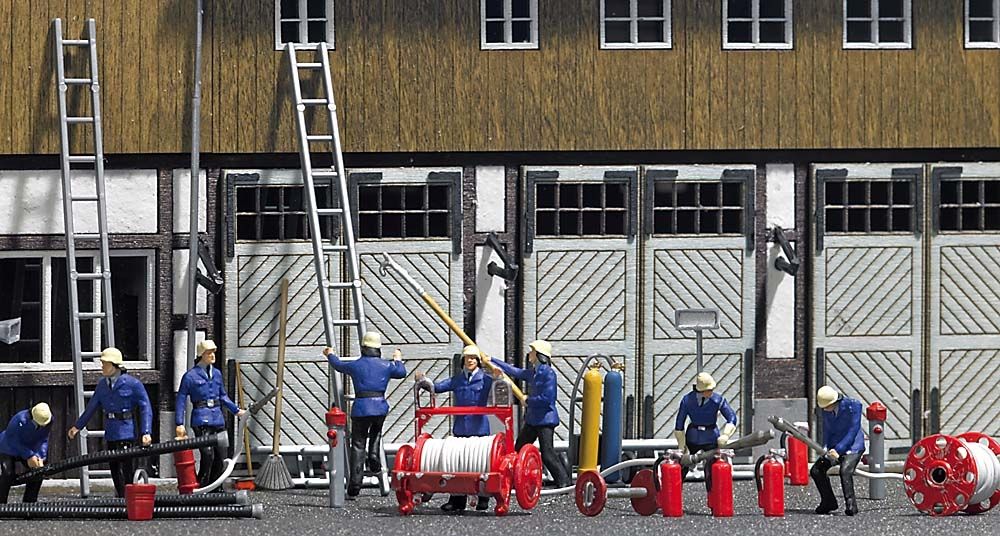 Kit containing the basic equipment for a fire department scene: ladders, hydrants, hand tools, bucket, broom, welding unit with tanks, jerry can, fire extinguisher, emergency lamp with stand, flexible hoses, etc. Cut out sheet included.