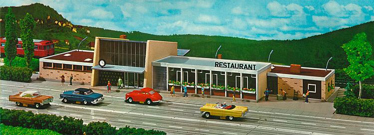 »Modern station with passenger hall flooded with light. The restaurant section can be furnished with the tables and benches supplied to give the building a very natural atmosphere.« (Text from the original catalogue).