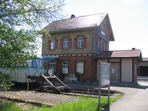 Royal Württemberg State Railways. Two-story station building with shingle and board formwork as well as two side extensions. The original model of this Württemberg type IIa standard railway station is located in "Kleinengstingen" in the Swabian Alb.