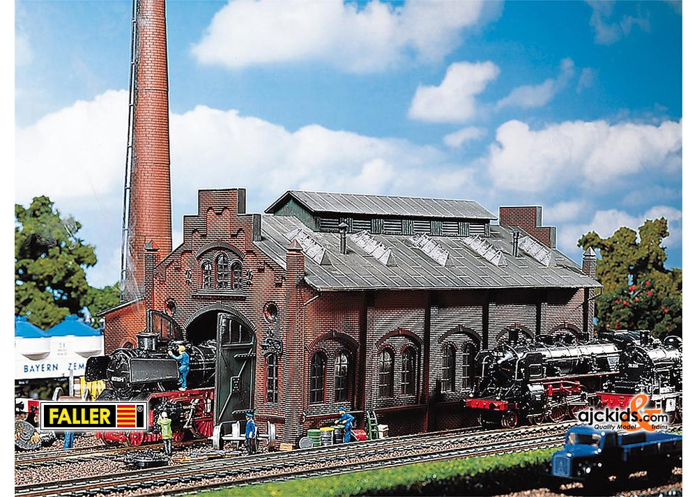 Space for vehicles up to 250 mm length over buffers. The chimney of the workshop outbuilding is ready for using a smoke generator (Seuthe no. 7). A particularly important feature of this model is the pass-through option, as both end walls feature large doors. The modular construction allows for variable configurations. Multiple buildings may also be constructed side by side.