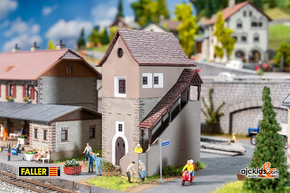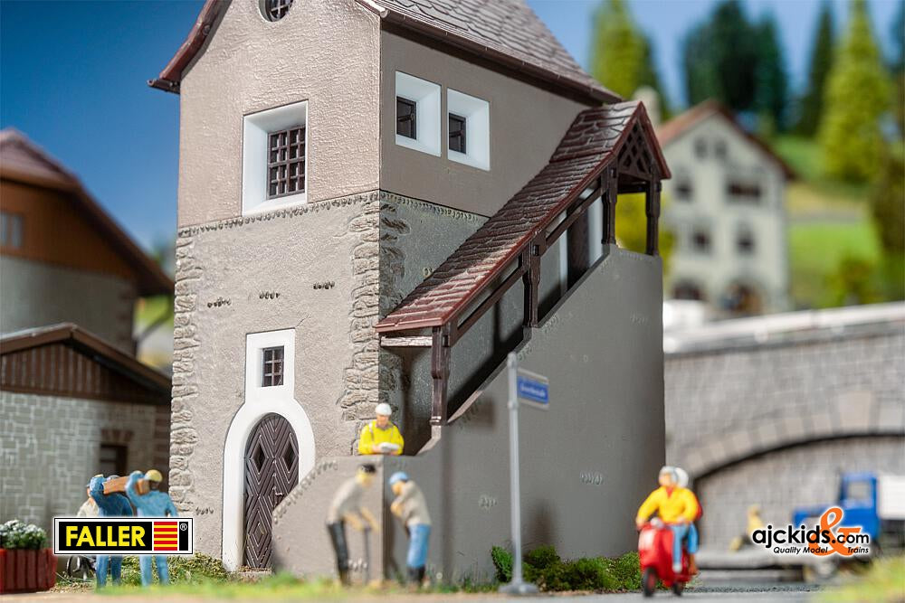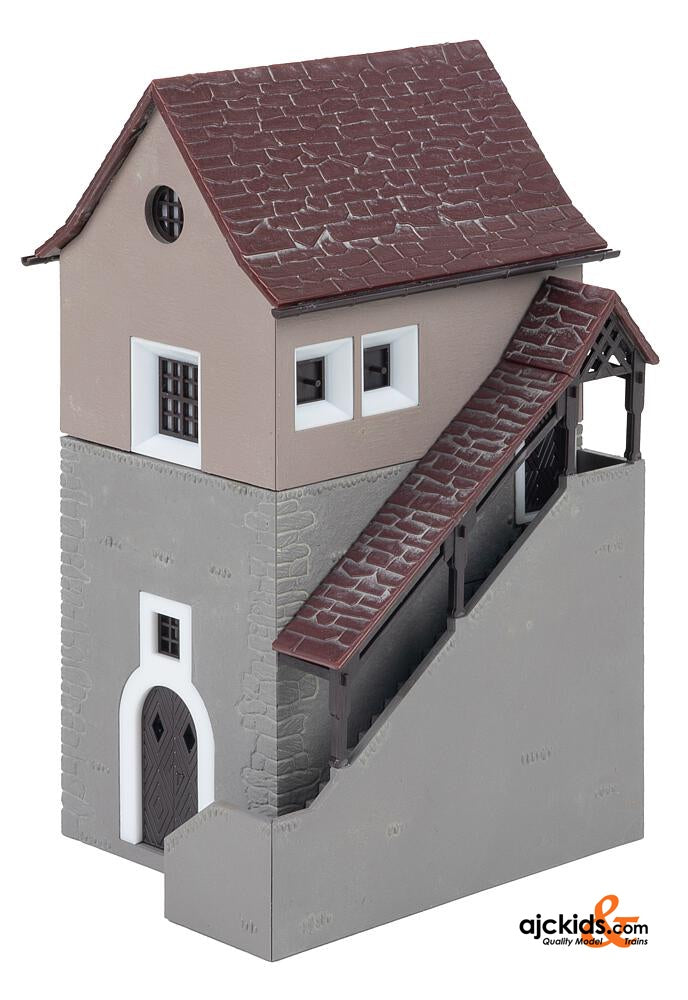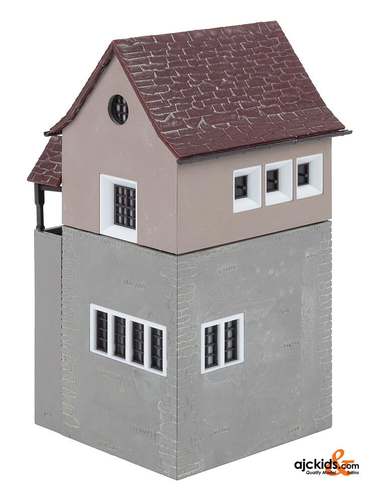The brick model switch tower impresses with its stone-faced plaster façade, which gives it a robust character. A covered external staircase leads up to the entrance and the gabled roof with red stone slabs gives the building a classic touch. Inside, all electronics are well protected and safely stowed away - a reliable place for controlling and monitoring technical processes in miniature format.