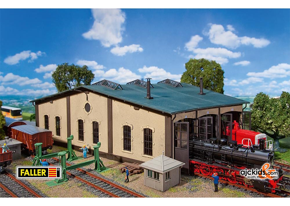 Three-platform, expandable engine shed with 7.5 degree partitioning with ridge turrets and large side and rear windows for the locomotives in your collection with up to 290 mm overall length. Servo drive components for all gates, as well as numerous accessories such as spindle lifting jacks, engineer waiting shelter and transformer station are included in the kit.