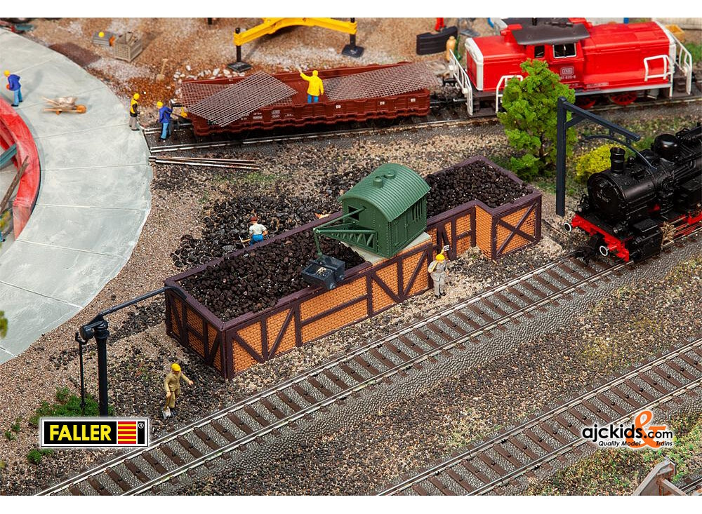 For your small engine shed. Coaling station with half-timbered coal bunkers, swivelling crane cabin with barrel roof, minecart, water spout and loading gauge. Bulk coal is provided for decoration.