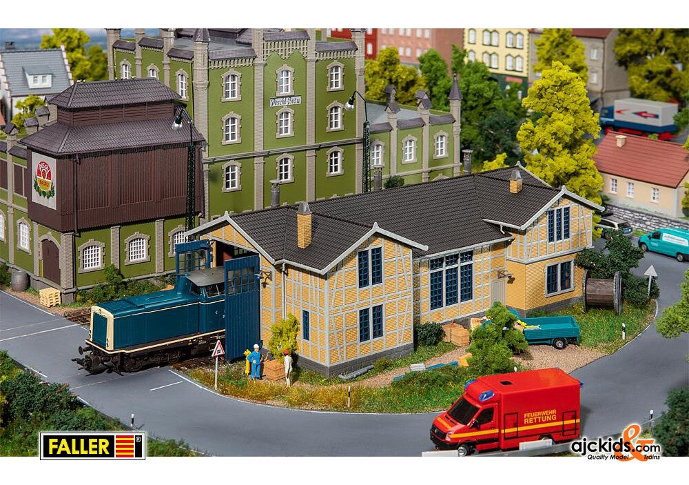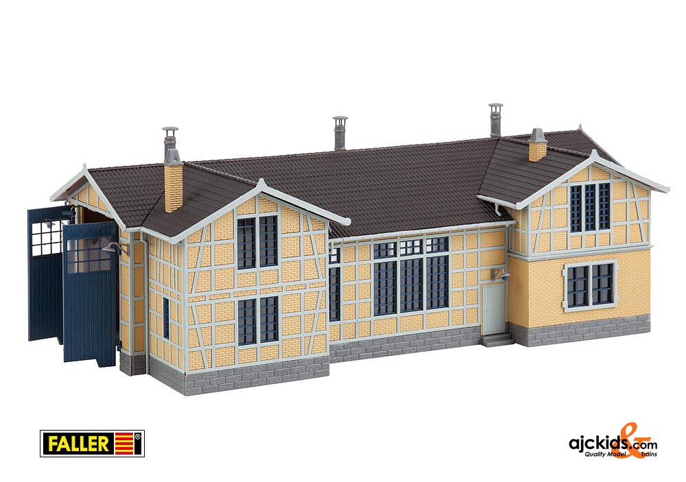 1-story roundhouse in half-timbered construction with light-colored beams and yellow clinker infill. The roundhouse has room for locomotives up to 230 mm LoB (total length).