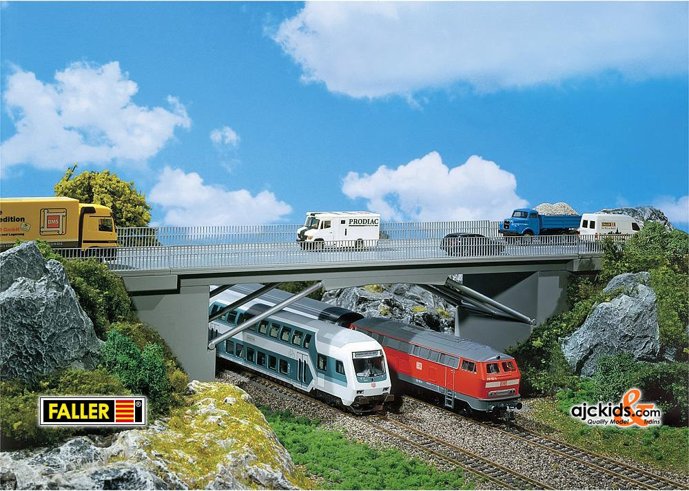 Modern concrete road bridge to be used as a flyover spanning a railway, road or river. The bridge is ready for use with the Car System. Lay the wire (not included), apply the roadway sheeting and the fun begins.