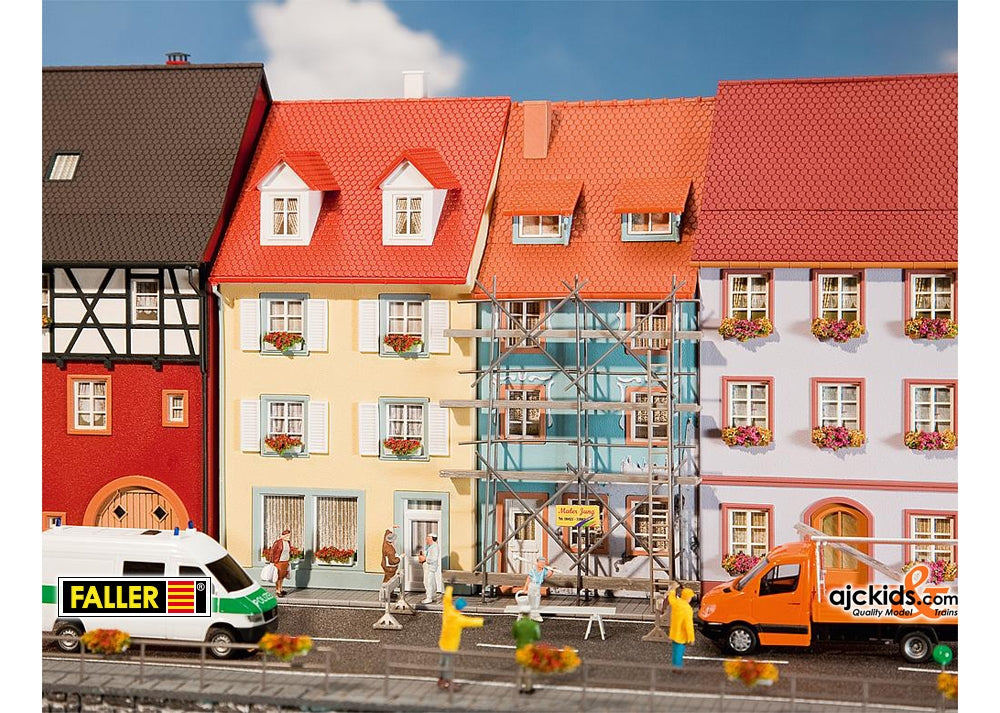 One of the houses is surrounded by scaffolding and is being painted. Scaffolding parts are included.