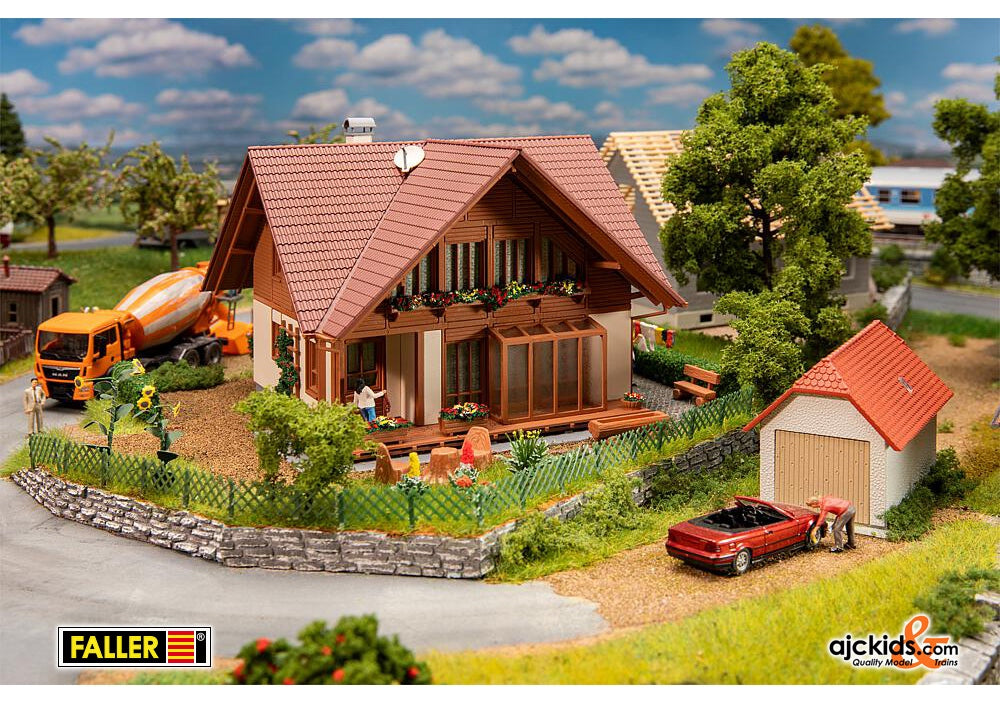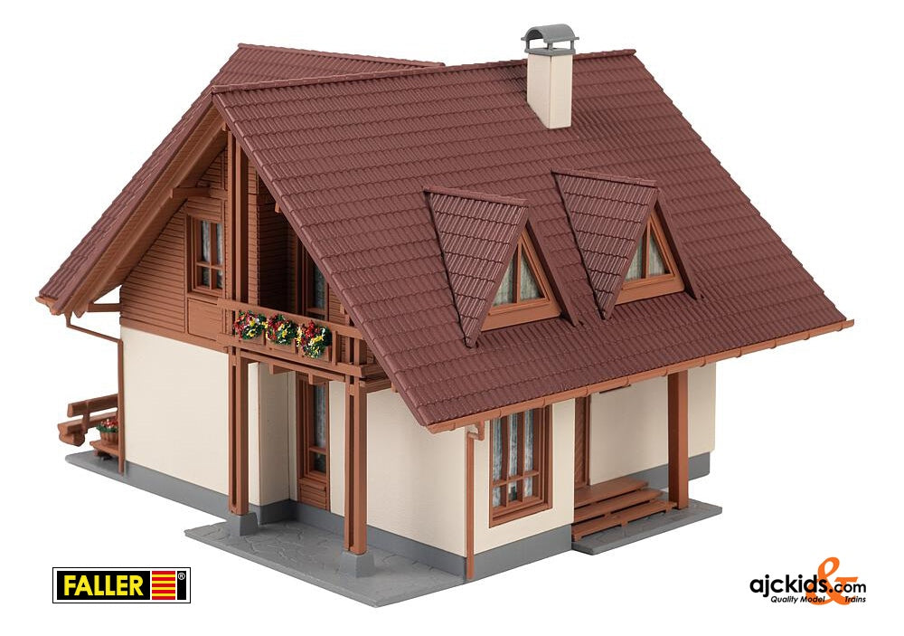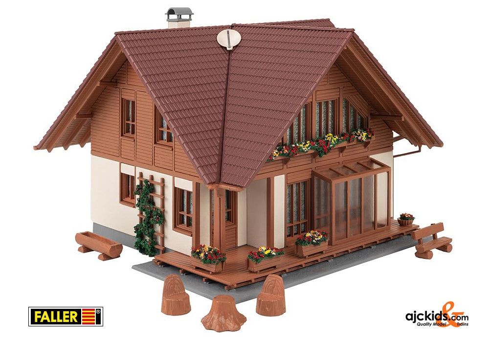 This architectural masterpiece was created based on an original model by Breisgau Haus from the late 1980s. It features a conservatory with a glass front and wooden frame, a covered balcony with a large tapered gable, a wooden veranda complete with flower pots and trellis. In keeping with the rustic charm of the 80s, there is a hollowed-out tree trunk as a water trough and several tree stumps for the garden.Dimensions