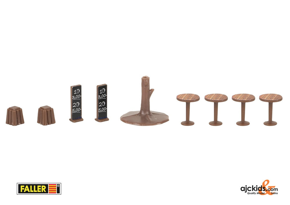 Contents: 2 Christmas market stalls, Christmas tree, fairy lights (connection: 5 V, DC voltage, 20 warm white LEDs, total length: 400 mm), bar tables (4 x), wooden stools (2 x), Christmas tree stand, signs (2 x)