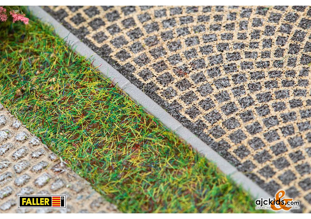 Road and path construction set with straight curbstones as a border between the footpath and the road.