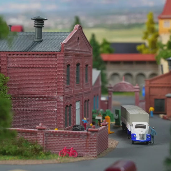 Factory from the turn of the century with red brick walls and a large hall with an attached chimney house and imposing chimney. A spacious ensemble consisting of the main building and two smaller halls with striking skylights complete the scenery. The kit also includes two representative brick wall enclosures with gates.
