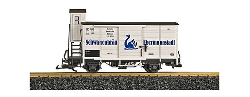 Two-axle private freight car Schwanenbrau Ebermannstadt, running on the Deutsche Reichsbahn. The model features the paint scheme and lettering of epoch II. The doors of the car open, but there is no beer inside.