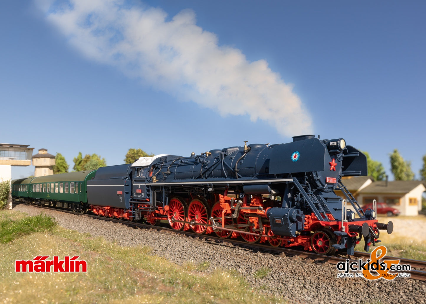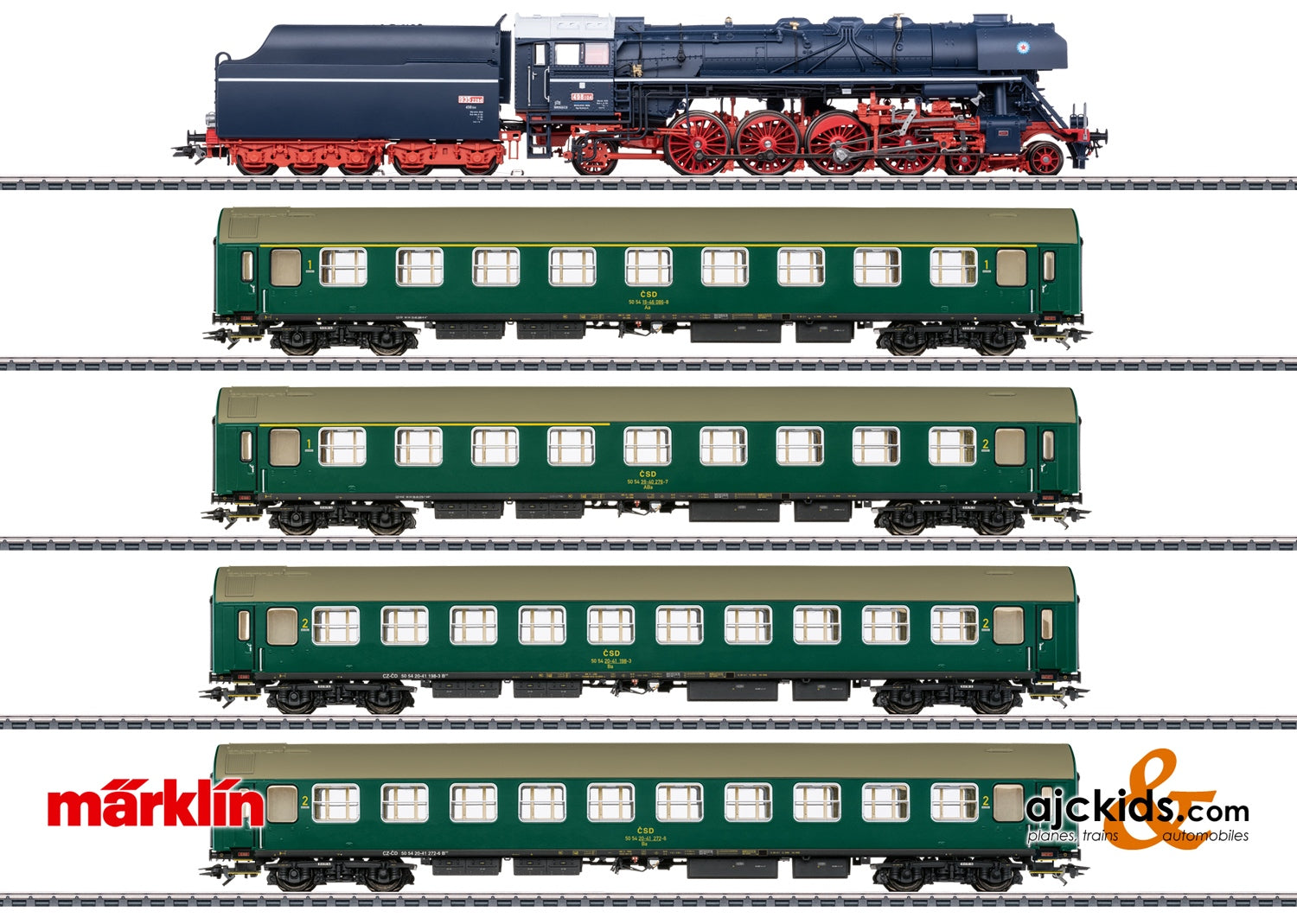 Prototype: Set consisting of the class 498.1 heavy steam express locomotive with a tender and four different UIC-Y design passenger cars. Version as museum locomotive 498.104 of the Železnice Slovenskej Republiky (ŽSR). Passenger cars in the museum version of the Czechian Railways (ČD). Two type Ba 256 cars, 2nd class, one type ABa 350 car, 1st/2nd class, and one type Aa 150 car, 1st class. The train looks as it did around 2018.