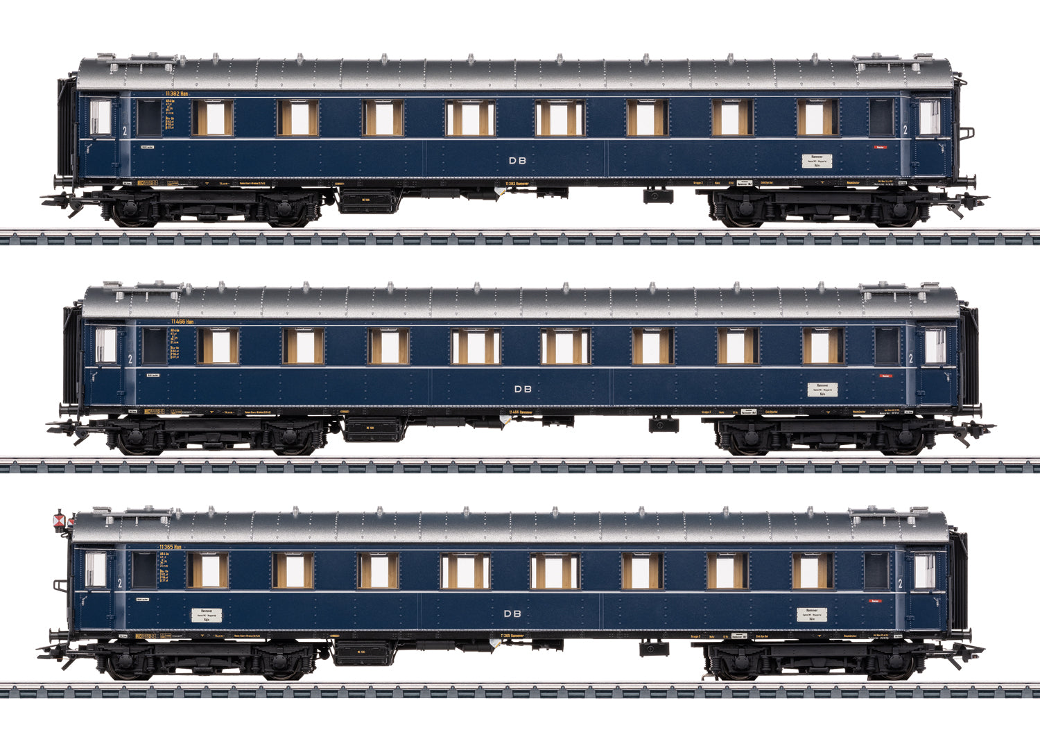 Model: These cars are detailed versions with full scale length. All the cars have factory-installed LED interior lighting with warm white LEDs and buffer capacitors. One car has factory-installed marker lights at one end. The pickup shoe on this car supplies current via the factory-installed current-conducting close coupler heads to the entire car consist. A fixed defined car sequence is prescribed for this purpose. Both ends of the car consist have the standard new close coupler heads for lower buffer heights. The passenger cars have multi-colored interior details. The trucks are type Görlitz II heavy. There are separately applied ladders and grab irons on the ends of the cars.