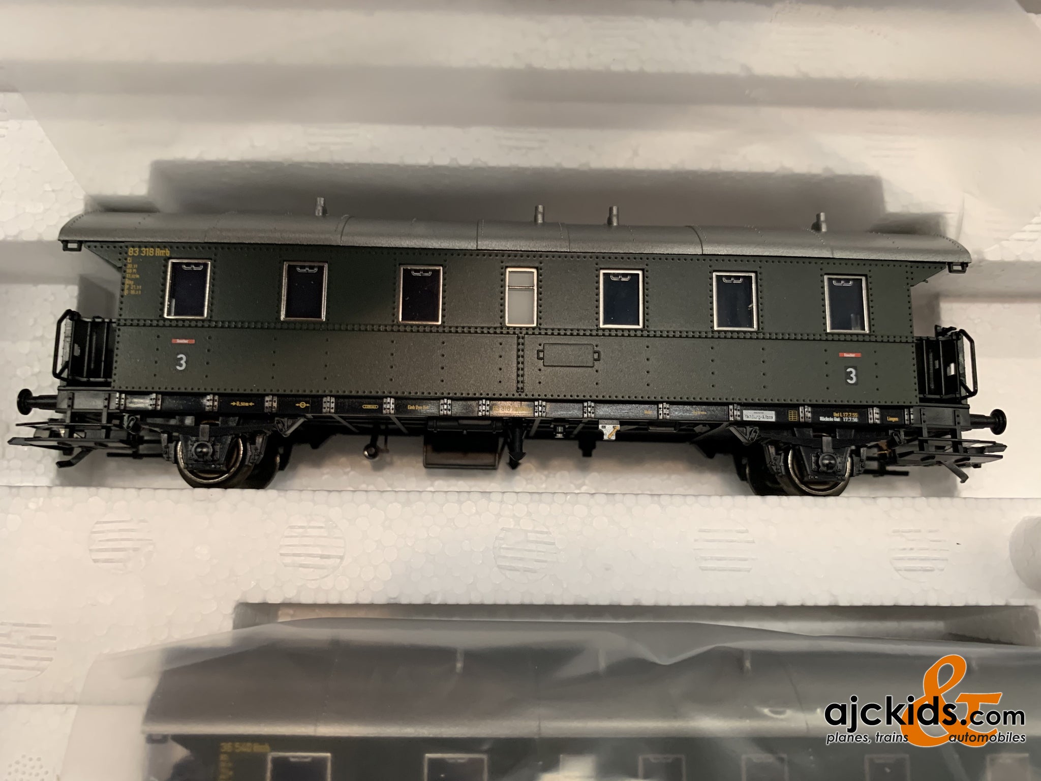 Prototype: German Federal Railroad (DB) corridor cars and a cab control car. The set consists of 3 "Donnerbüchsen" / "Thunder Boxes", two type Ci, 3rd class, and one type BCi, 2nd/3rd class, and one type Pwif-41/52 passenger train baggage car with a cab. The cars look as they did in the mid-Fifties.
