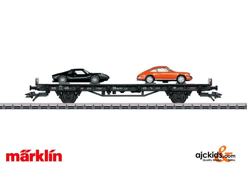 Model: The flat car has a long wheelbase. The flat car has load restraints for vehicles. The car is loaded with one Porsche model from the firm Schuco and one Porsche model from the firm Wiking. Length over the buffers 15.5 cm / 6-1/8". DC wheel set E700580.
