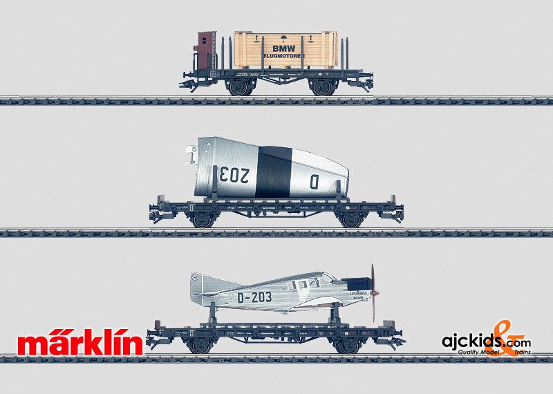 Model: 2 long wheelbase flat cars and 1 shorter car with stakes that can be mounted on it. Airplane model (Wiking) included as a load. The fuselage and wings are pre-assembled and safeguarded with transport frames. Wooden shipping crate included. The railroad cars and the airplane are not available separately.