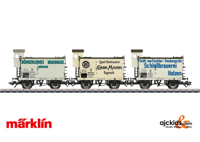 Prototype: 3 different privately owned beer cars for the breweries "Bürgerliches Brauhaus München", "Schlossbrauerei Holzen", and "Gebr. Maisel" of Bayreuth, used on the Royal Bavarian State Railroad (K.Bay.Sts.B.). Version with a brakeman's cab. The cars look as they did around 1912.