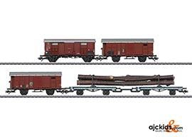 Model: The type K3 boxcars have sliding doors that can be opened. The roof for the boxcar with a peaked roof is made of metal. The pair of load cradle cars is loaded with real wood. A drawbar for a permanent connection between the pair of cars is included. All of the cars are individually packaged. There is also a master package.