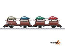 Model: There is a permanent close coupling between the car halves. The upper deck can be lowered. The cars have new car numbers. The cars are loaded with 8 different models of the VW Beetle from the firm Brekina. Suitable chock blocks are included.