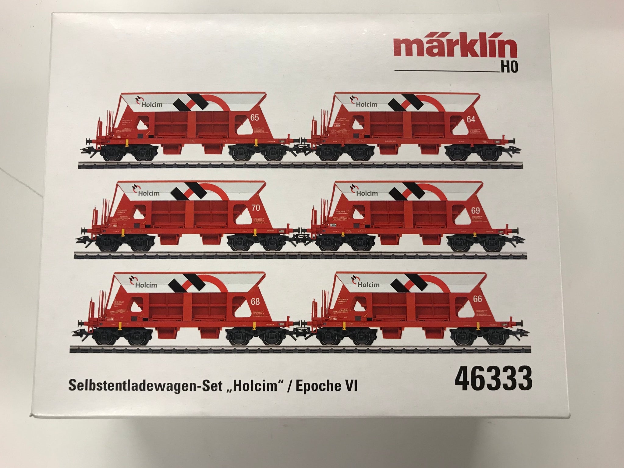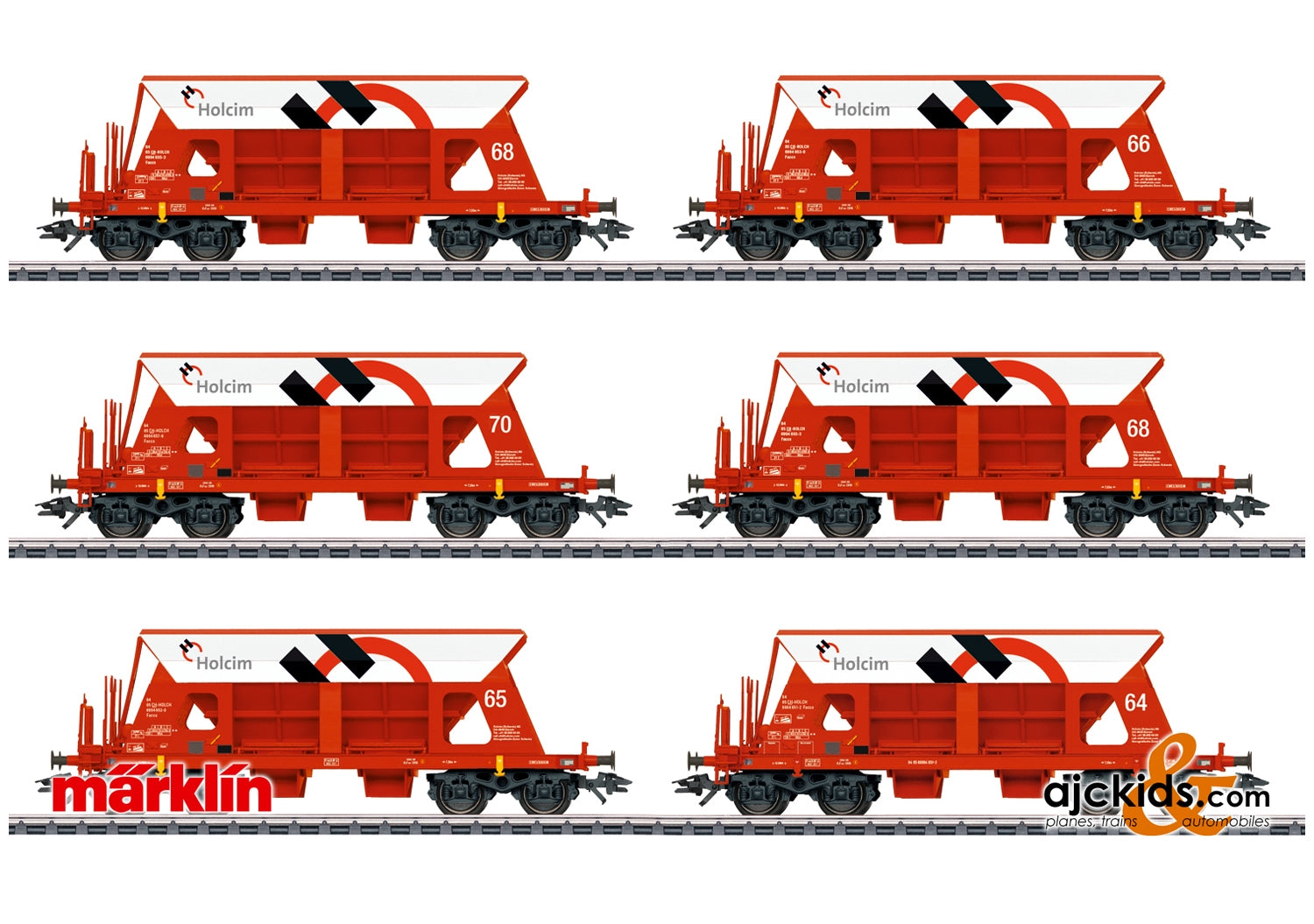 Prototype: Six four-axle hopper cars painted and lettered for the firm Holcim. Type Faccs. Used in Switzerland. The cars look as they did in Era VI.