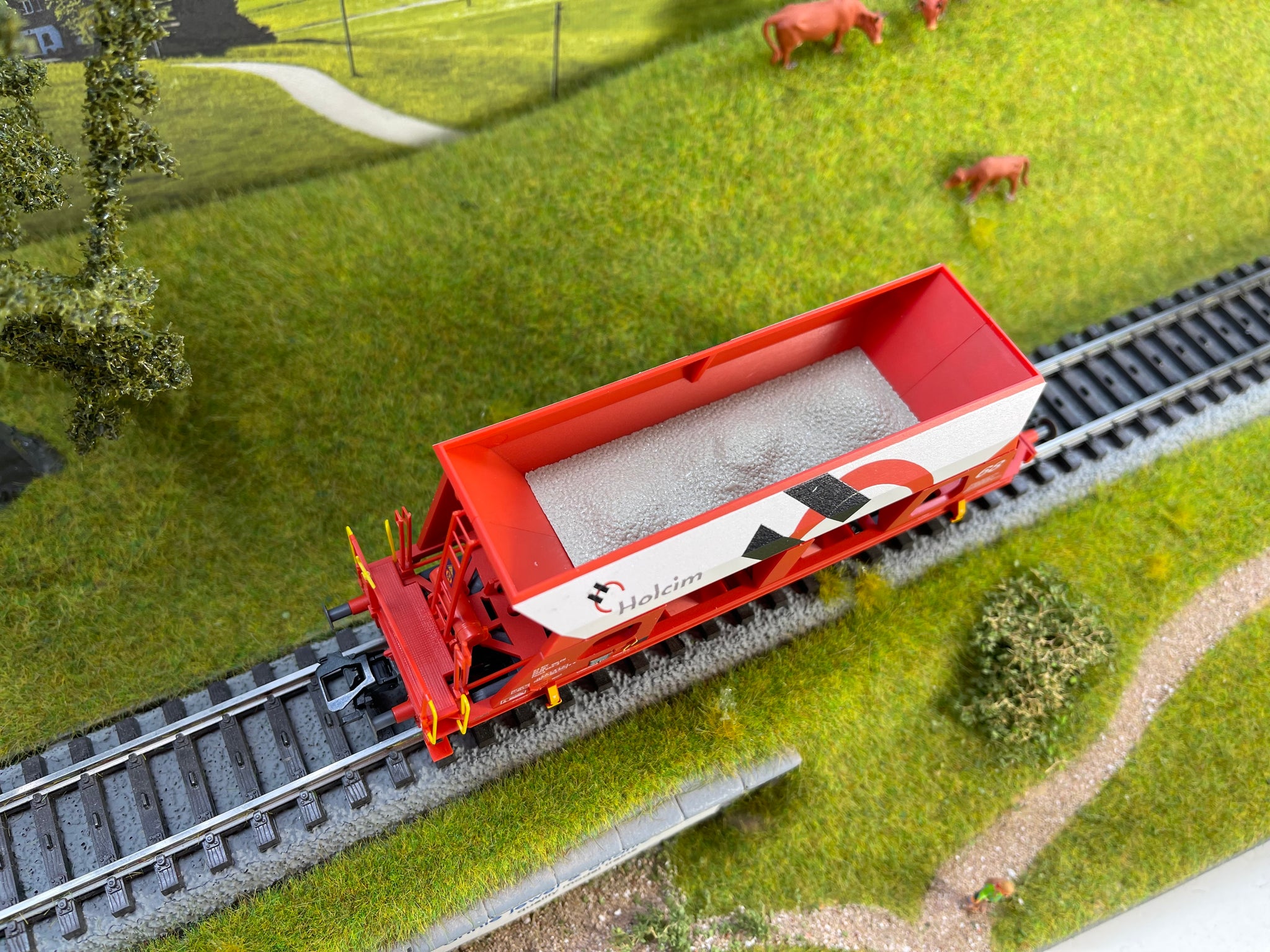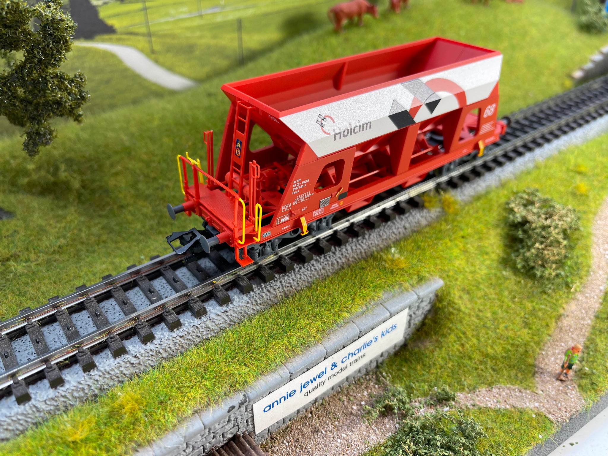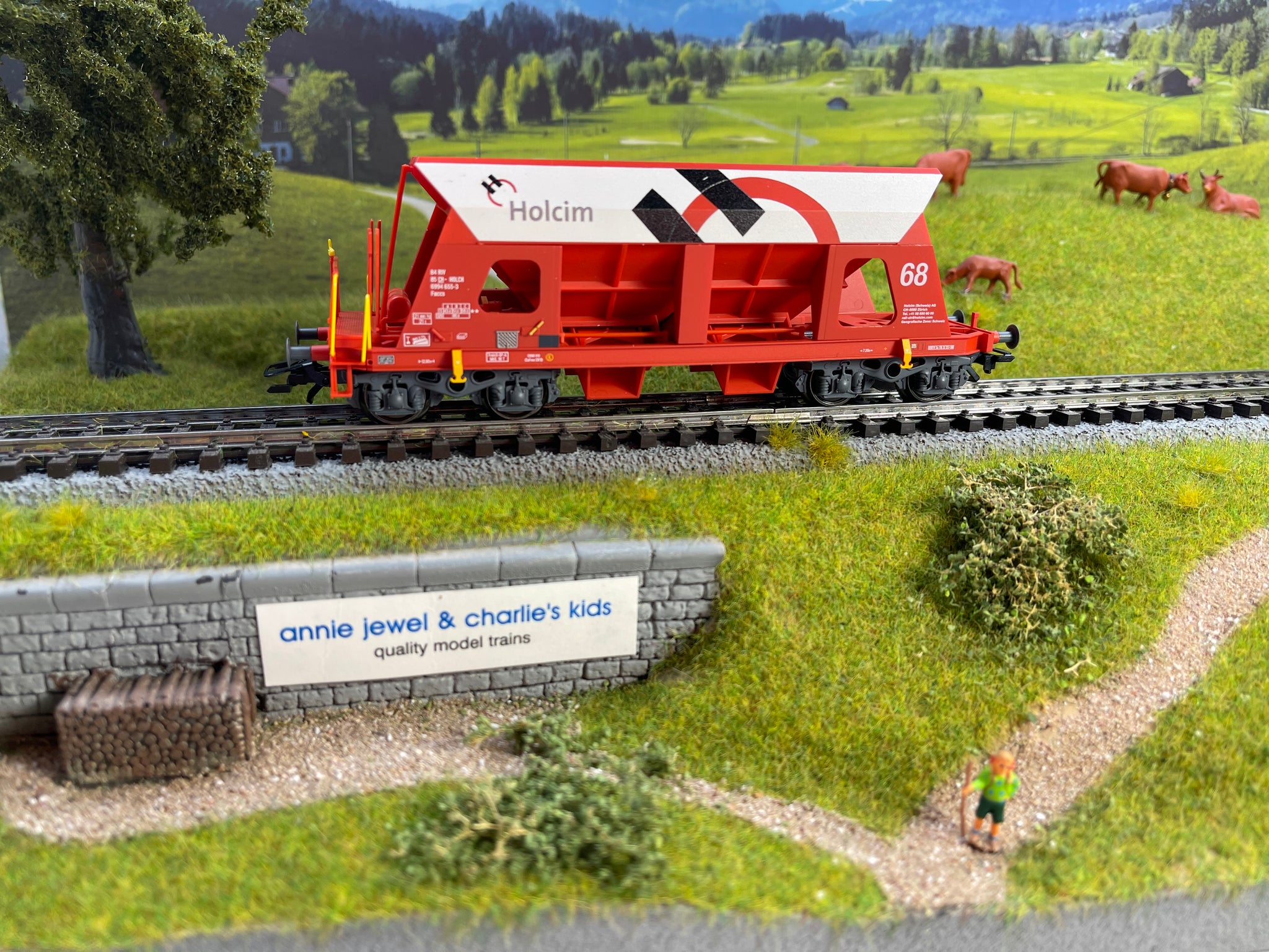 Model: The hopper cars are in the Holcim paint scheme of "Blood Orange" with different registration and car numbers. The hopper cars have separately applied details.