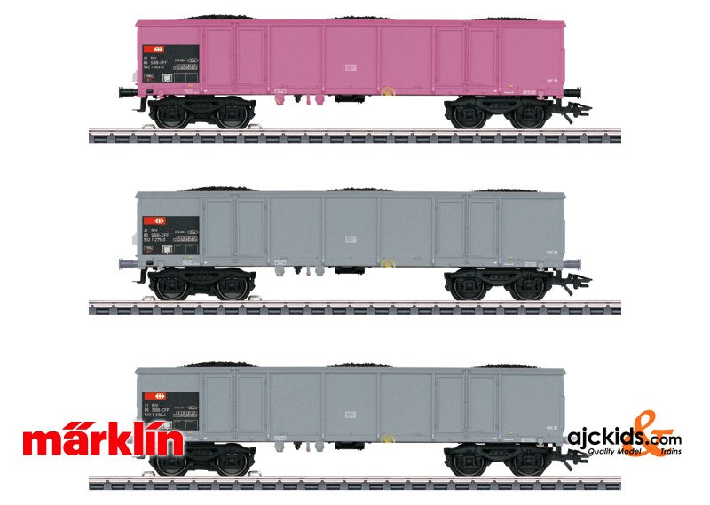 Prototype: 3 Swiss Federal Railways (SBB/CFF/FFS) type Eaos high-side gondolas. The cars look as they did after 1985.