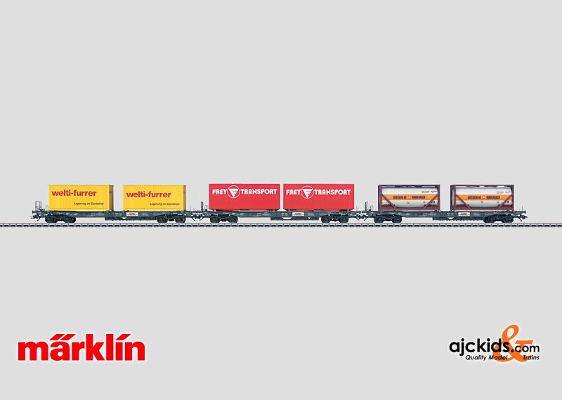 Model: The cars' frame, floor, and the deep well area are made of metal. The cars have special low-riding trucks. They also have many separately applied details. The load restraints are adjustable. One car is loaded with two 20 foot tank containers, one car is loaded with two convertible truck transport units, and one car is loaded with two 20 foot containers. The loads can be removed from the cars. The cars have different car numbers and the loads have different registration numbers. The cars and the loads come individually packaged.