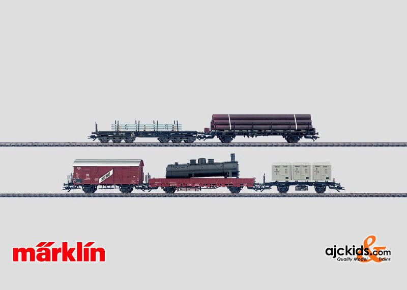 Prototype: 5 different DB freight cars. Model: Flat car without sidewalls. Loaded with pipe, stacked on wood frames and safeguarded with banding. Flat car has separately applied destination boards. Loaded with 3 removable box-style containers with differe