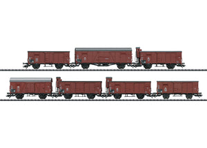 Prototype: 7 different design German Federal Railroad (DB) boxcars. Of them 5 type G 10 Association Design freight cars, 2 of them with "Economy" brakeman's cabs, 1 of them with a standard brakeman's cab. 1 of them with the brakeman's cab removed, 1 of them without a brakeman's cab and 1 of them without a brakeman's platform. 1 type Glt 23 (Glt Dresden) Interchange Design freight car with a low door on the end wall. 1 type Gr 20 (Gr Kassel) Interchange Design freight car without a hand brake. The cars look as they did in the mid-Fifties.