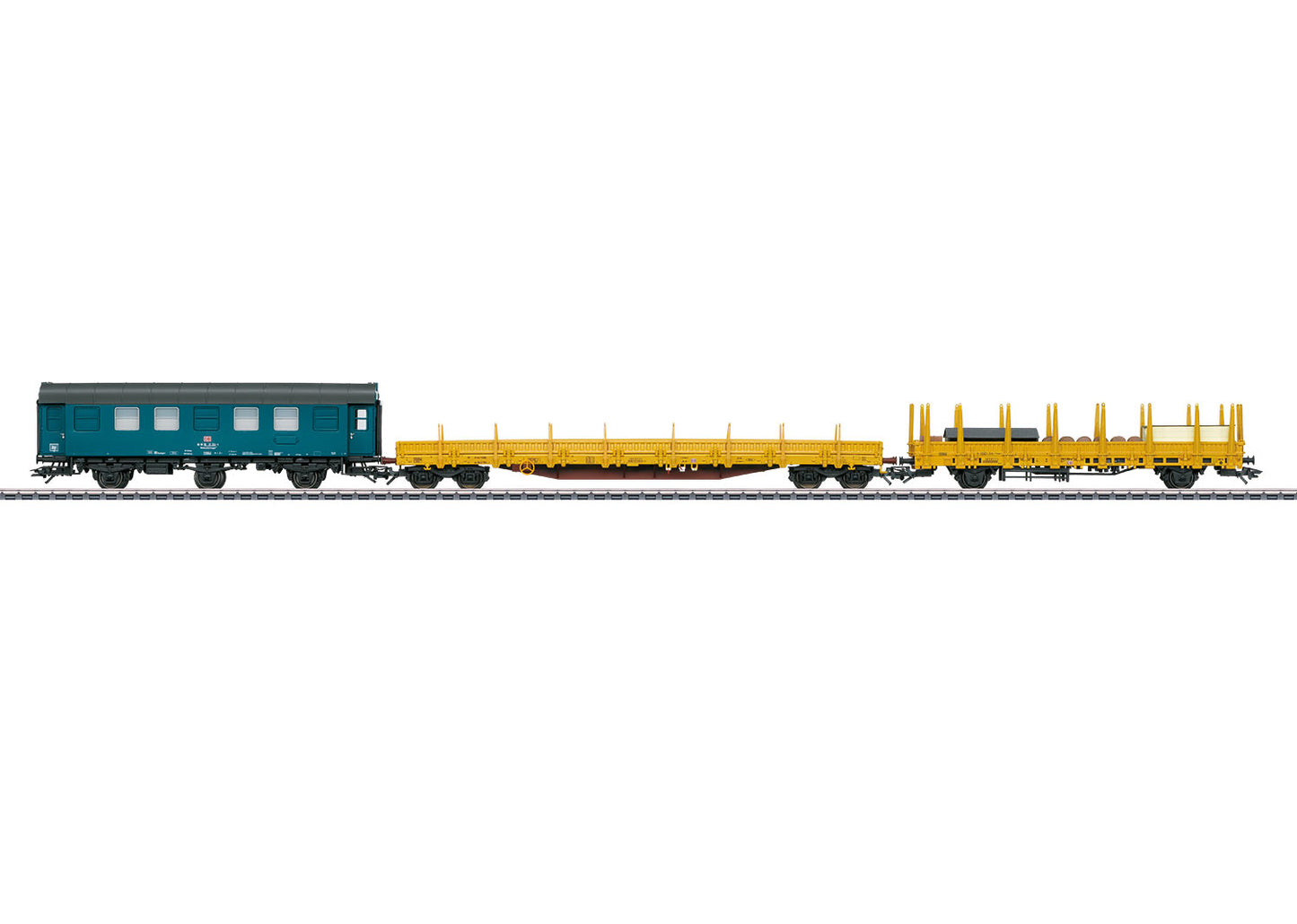 Prototype: A type Kls 442 2-axle low side car, a type Res 676 4-axle low side car, and a type 423 railroad maintenance car as a crew quarters car, all of the cars painted and lettered for the German Railroad, Inc. (DB AG). The cars look as they did in 1997.