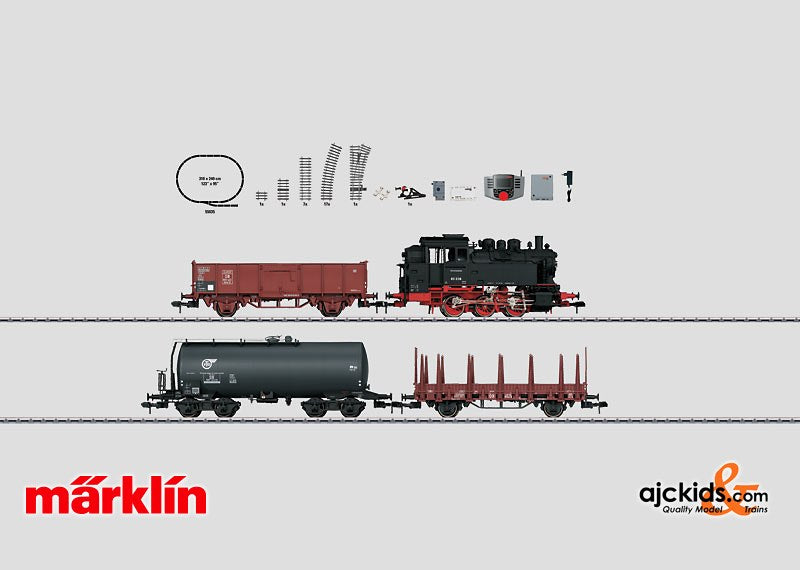 Contents: 7 no. 5903 straight track, 1 each no. 5916 and no. 5917 straight track. 17 no. 5935 curved track, 1 no. 5977 right turnout (without the additional adjustment section), and 1 track bumper. Ajckids furnishes this set with a 120 volt / 60 VA power supply. 60653 Mobile Station digital controller. 60112 digital Connector Box. 5625 turnout mechanism and 60830 K83 decoder. Connection hardware and track clips are included.