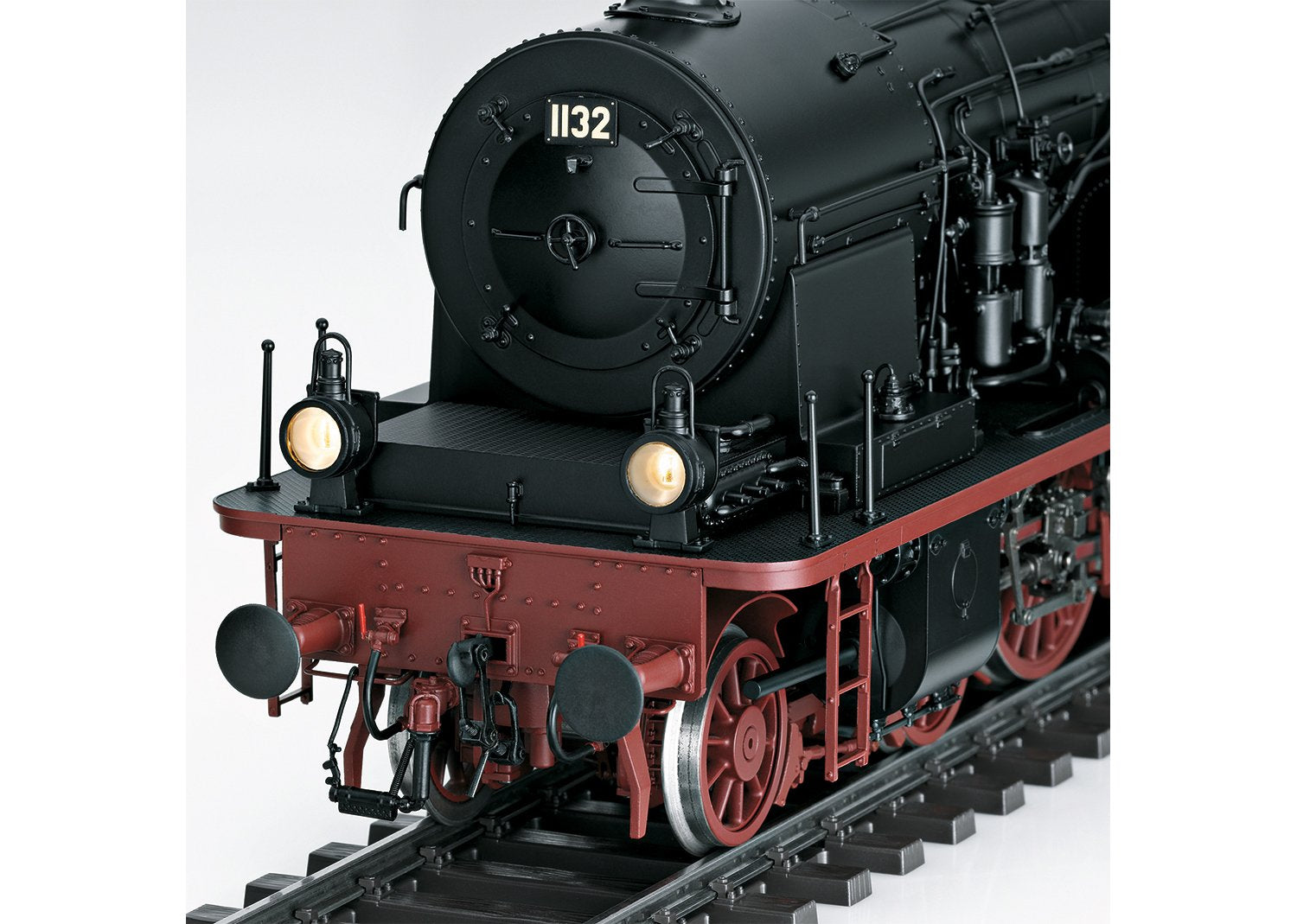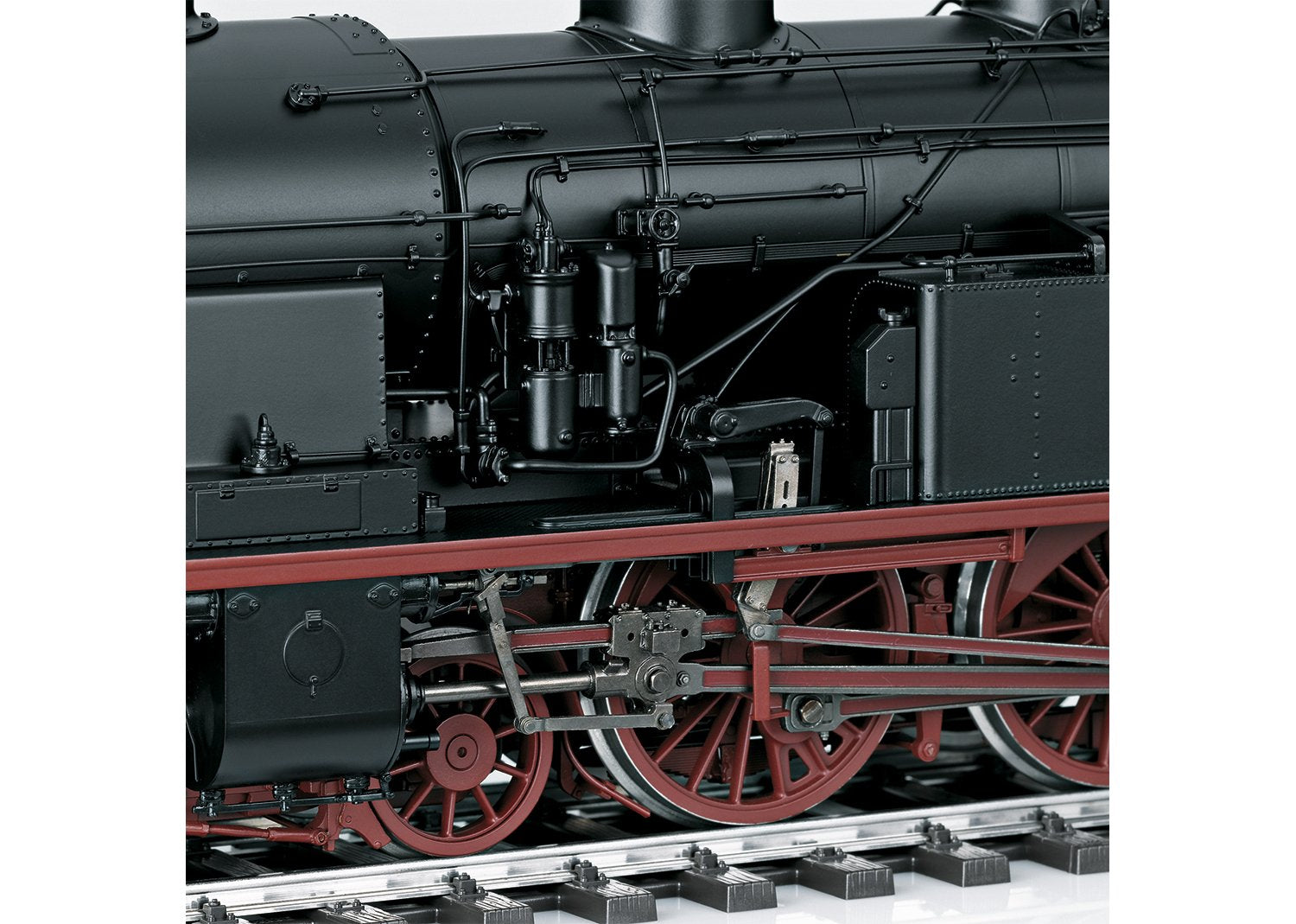 The locomotive can be operated with AC power, DC power, Märklin Digital, and DCC. The locomotive has a built-in current buffer. All driving axles powered. The locomotive has a built-in smoke generator with steam chuffing synchronized to the wheels, cylinder steam, and a steam whistle. There are double headlights front and rear that change over with the direction of travel. The light color is correct for the era. The headlights will work in conventional operation and can be controlled digitally. Maintenance-free, warm white LEDs are used for the lighting. Red marker lights can be controlled. The locomotive has sprung buffers, and cab and firebox lighting. The locomotive comes with a prototype coupler on the front and a remote controlled Telex coupler on the rear. Both couplers can be replaced by the other type. The valve gear switchover is in 3 steps (forward, reverse, continuous operation). An accessory package with one each reproduction prototype coupler and a Telex coupler, smoke fluid, and a figure of a locomotive engineer and a fireman is included with the locomotive. The locomotive is mounted on an aluminum base painted black for display case presentation.