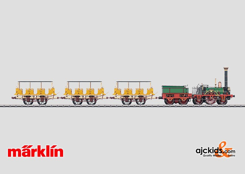 Model: The "Adler" locomotive has an mfx digital decoder. It can be operated with AC power, DC power, Märklin Digital, and Märklin Systems. There are 2 powerful, miniature can motors with bell-shaped armatures, mounted in the tender. 2 axles powered. The locomotive has 2 free-standing lanterns with maintenance-free LED's on the front. They will work in conventional operation and can be controlled digitally. The driving wheels do not have flanges, like the prototype. There is a special coupling between the locomotive and tender. The locomotive has a detailed platform for the engineer. The train has 3 open passenger cars, 3rd class, with an all-weather roof. The frames for the cars are partially open like the prototype. The cars have special couplings. The minimum radius for operation is 600 mm / 23-5/8".