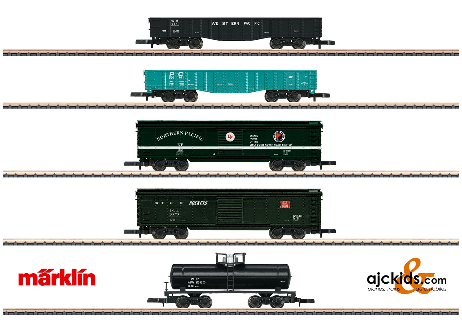Prototype: 5 different American freight cars, 2 gondolas painted and lettered for Western Pacific and Penn Central, 2 boxcars painted and lettered for Northern Pacific and Rock Island, and 1 tank car painted and lettered for Western Pacific. The cars look as they did in Era IV.