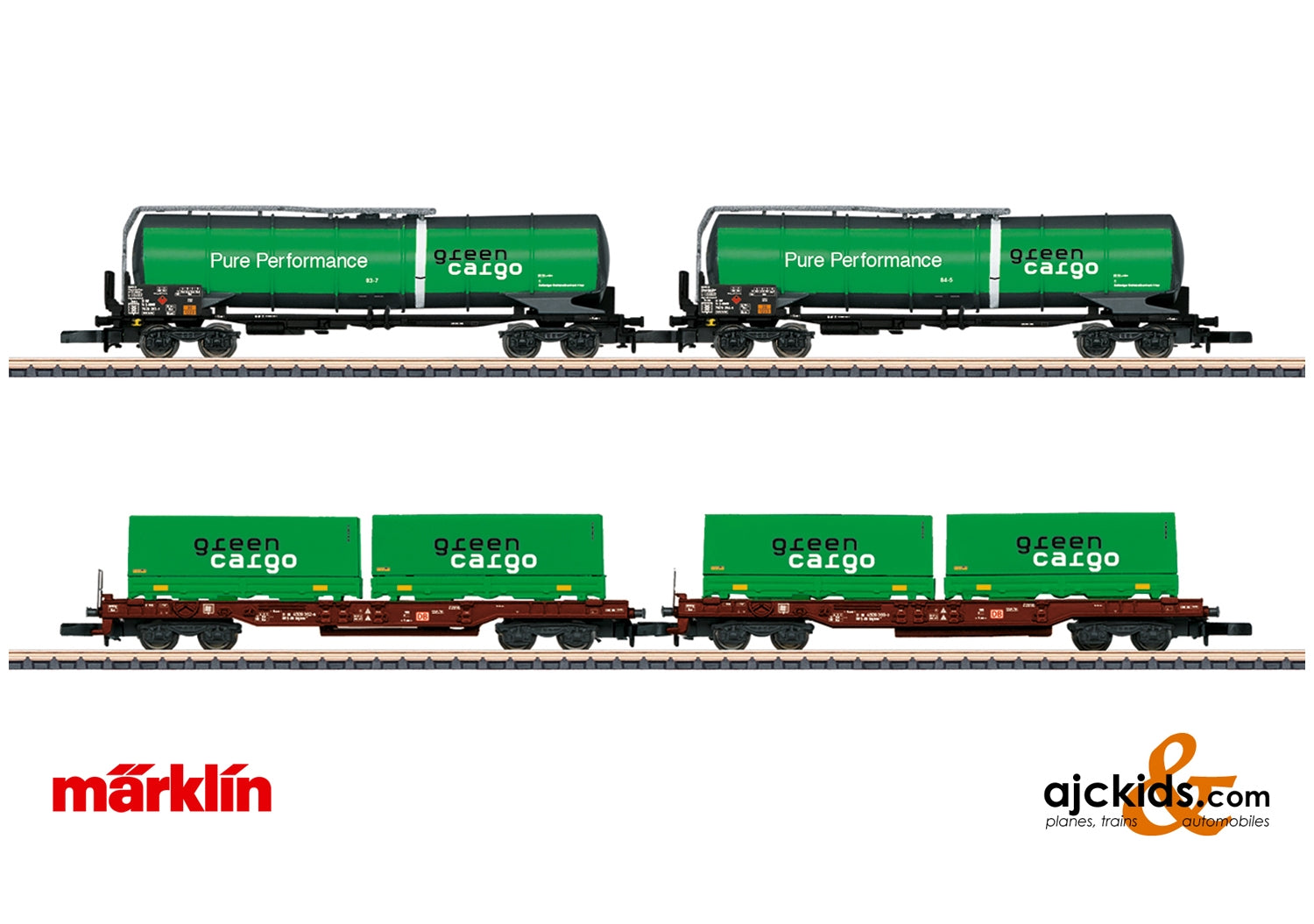 Model: The deep-well flat car frames are constructed of metal. Each deep-well flat car is loaded with 2 removable interchangeable transport units for trucks lettered with advertising for "Green Cargo" for Ermewa, Inc. The funnel-flow tank cars for Ermewa, Inc. are for transporting airplane fuel and are finely detailed. The cars are finely painted and lettered. All of the cars have different car numbers and the interchangeable transport units have different registration numbers. The cars have close coupler hooks. Total length over the buffers approximately 315 mm / 12-3/8".