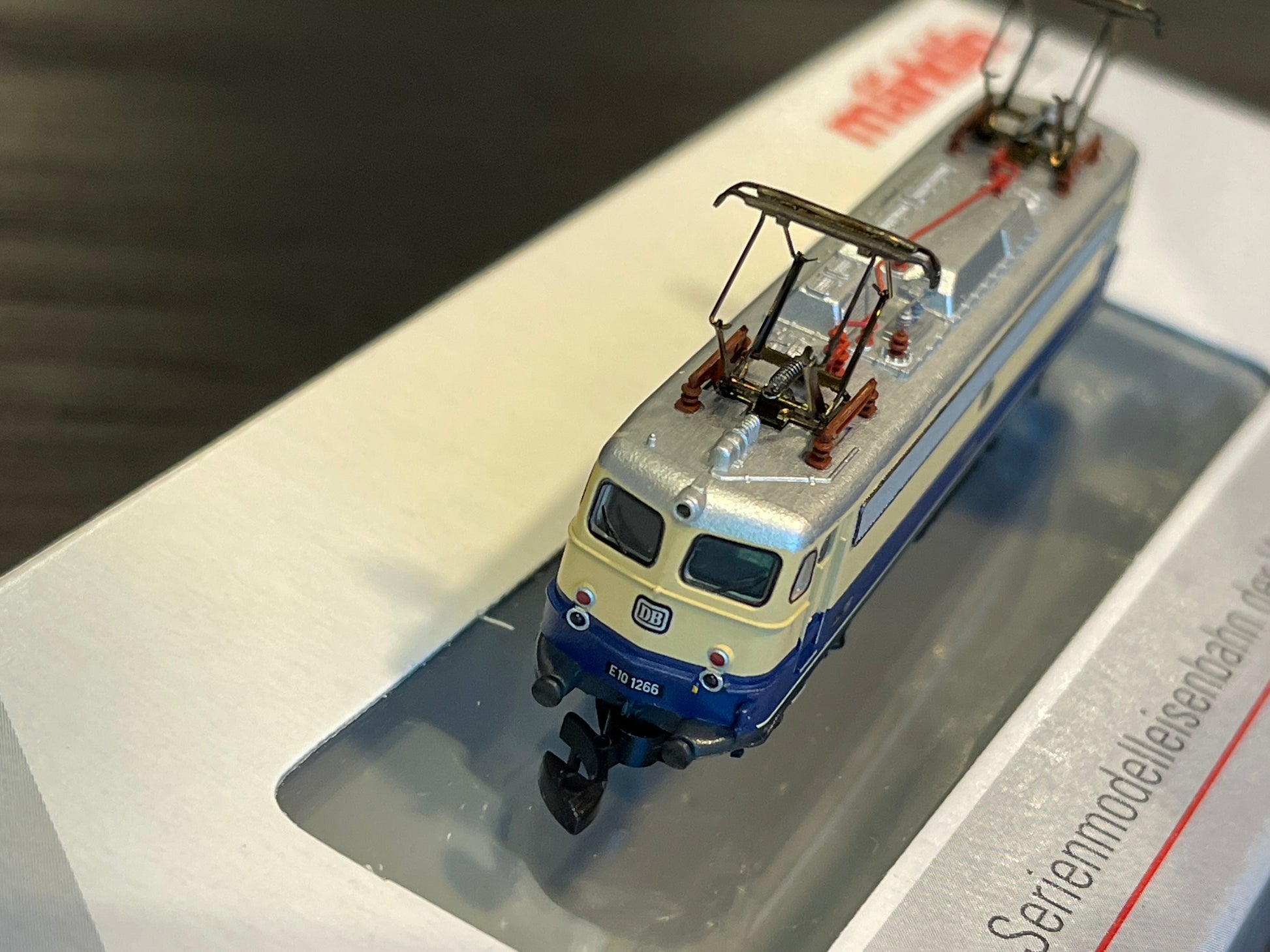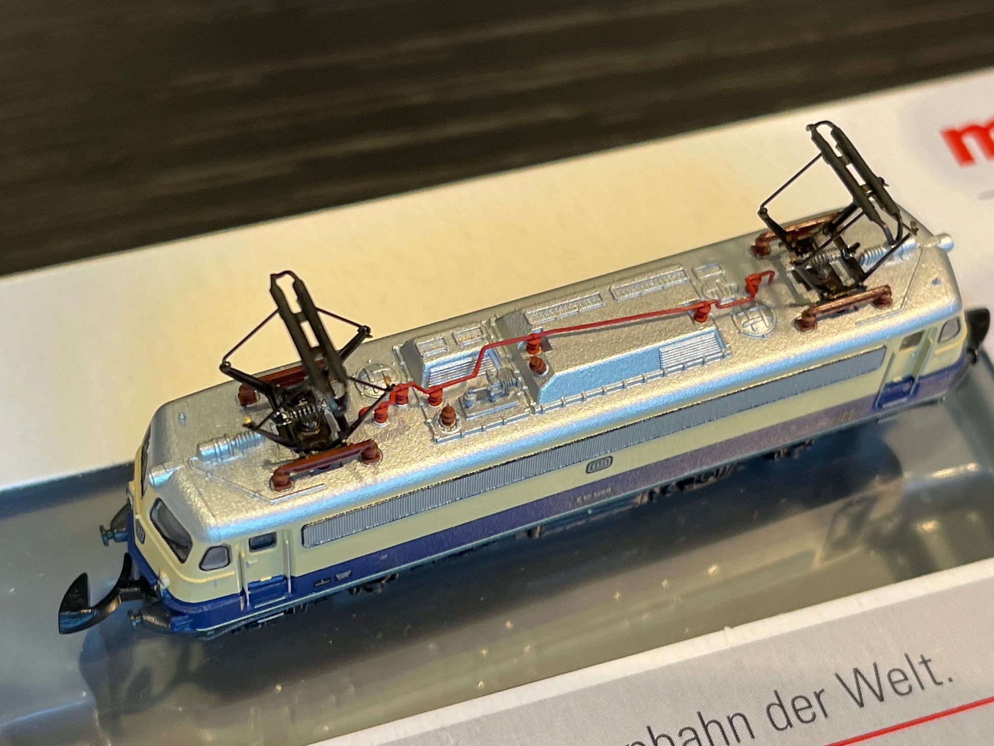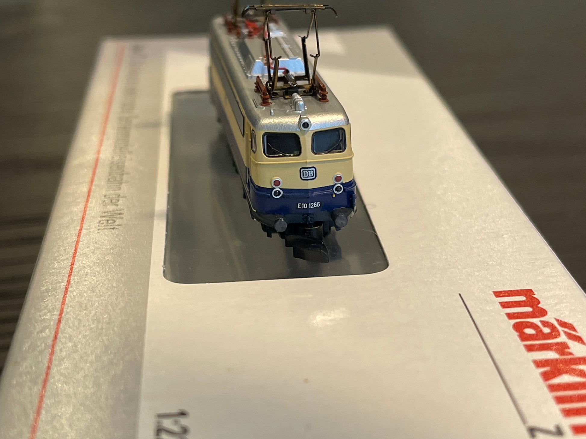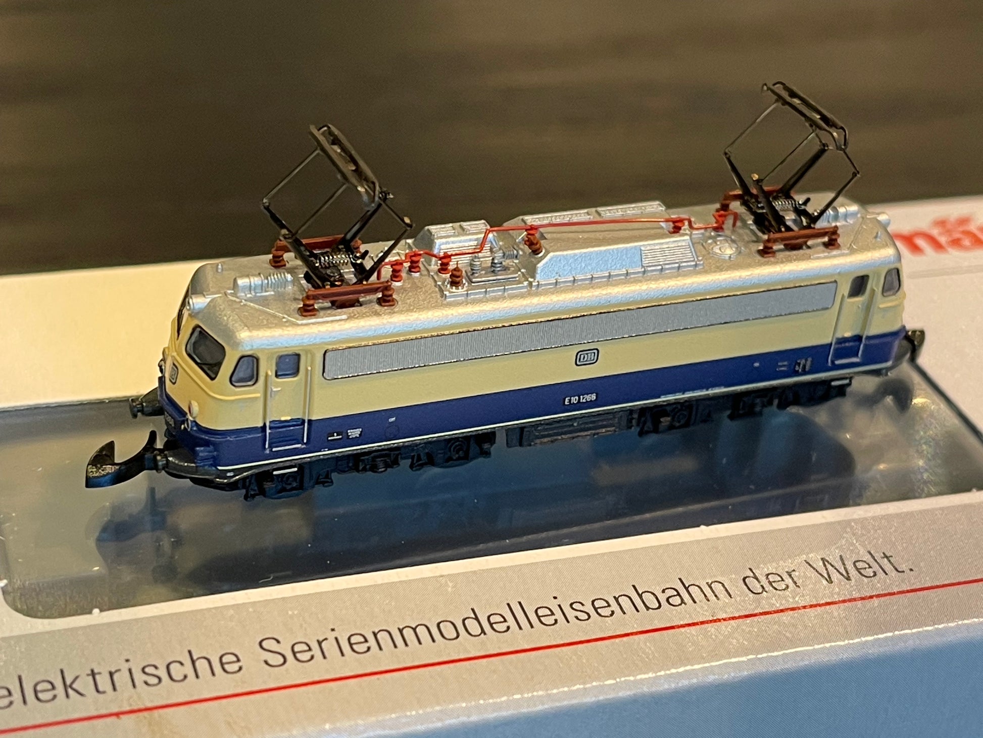 Prototype: German Federal Railroad (DB) class E 10.12 electric locomotive. With the "Bügelfalten" / "Pants Crease" ends, continuous ventilation bands, continuous rain gutter, and buffer cladding. B-B wheel arrangement. Beige/cobalt blue paint scheme. The locomotive looks as it did around 1962/1963.