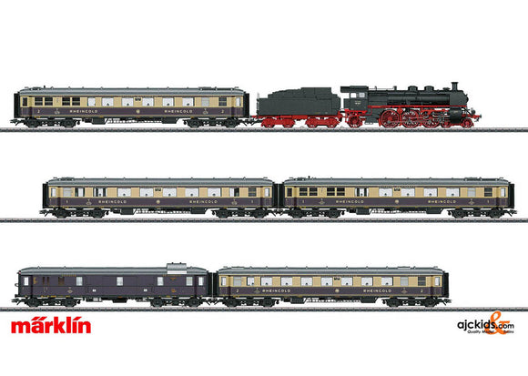 Prototype: Rheingold train set consisting of a class 18.5 steam express locomotive with a type 2´2´T31,7 tender in the black/red basic paint scheme for use as a Rheingold locomotive, 1 type SB4ük-28 parlor car, 2nd class with a galley, 1 type SA4ü-28 parlor car, 1st class without a galley, 1 type SA4ük-28 parlor car, 1st class with a galley, 1 type SB4ü-28 parlor car, 2nd class without a galley, 1 type SPw4ü-28 baggage car.