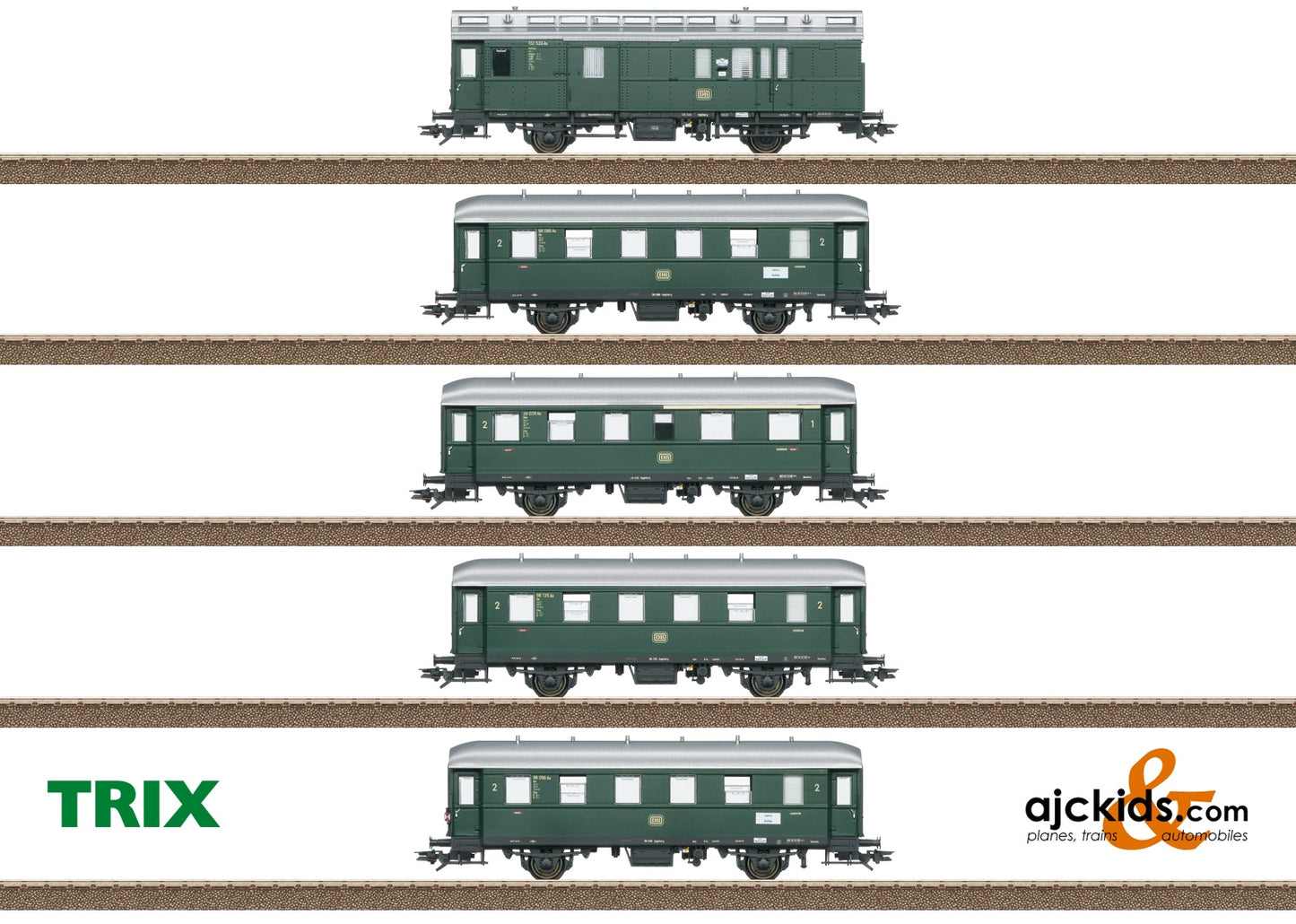 Prototype: Five German Federal Railroad (DB) passenger cars. One type PwPostie baggage/mail car, one type Abie corridor car, 1st/2nd class, and three type Bie corridor cars, 2nd class. Bottle green paint scheme. The cars look as they did around 1958.