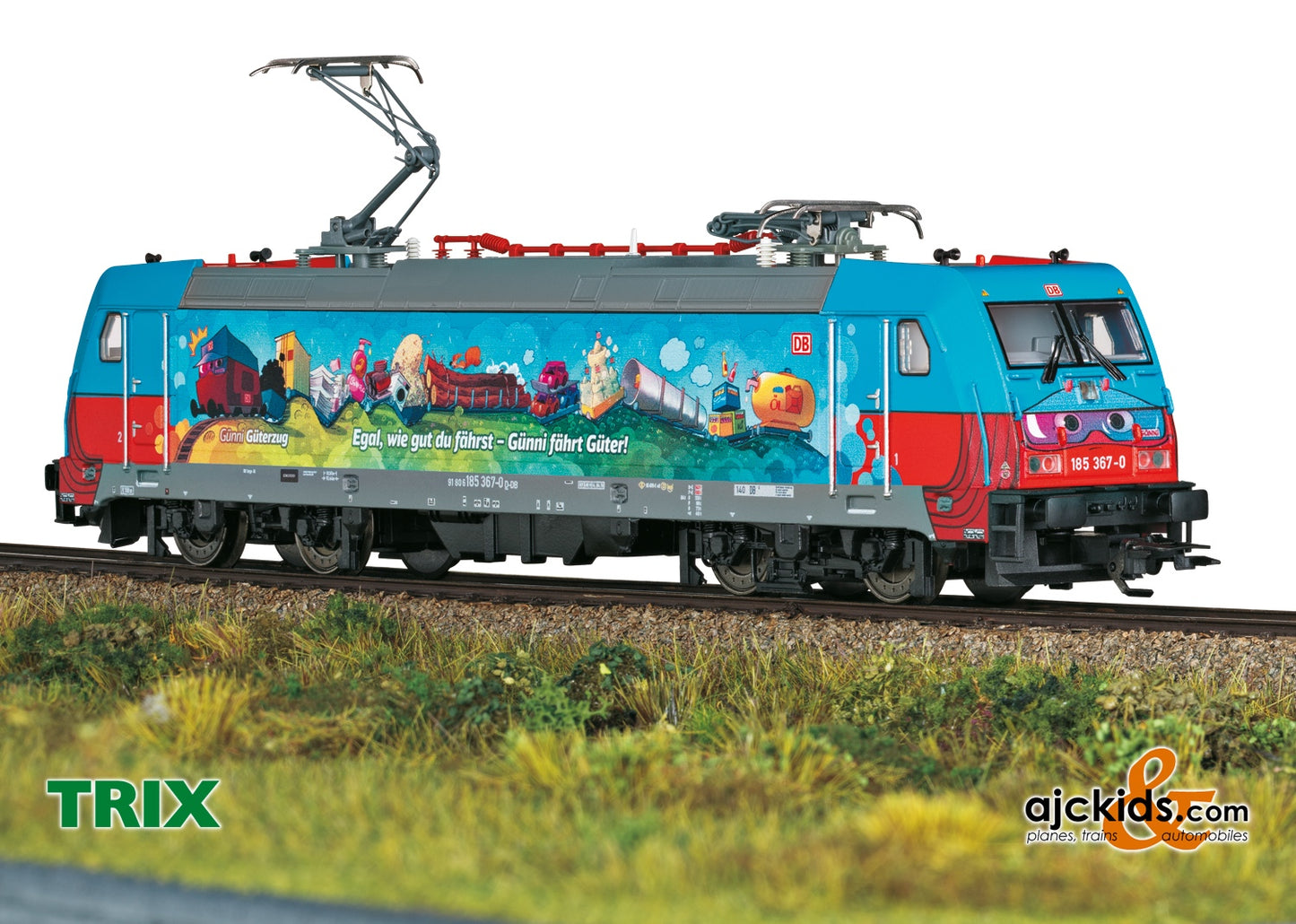 Prototype: German Railroad, Inc. (DB AG) class 185.2 electric locomotive. Locomotive road number 185 367-0. The locomotive looks as it did starting in September of 2019 in the striking promotional design as the "Günni Freight Train".